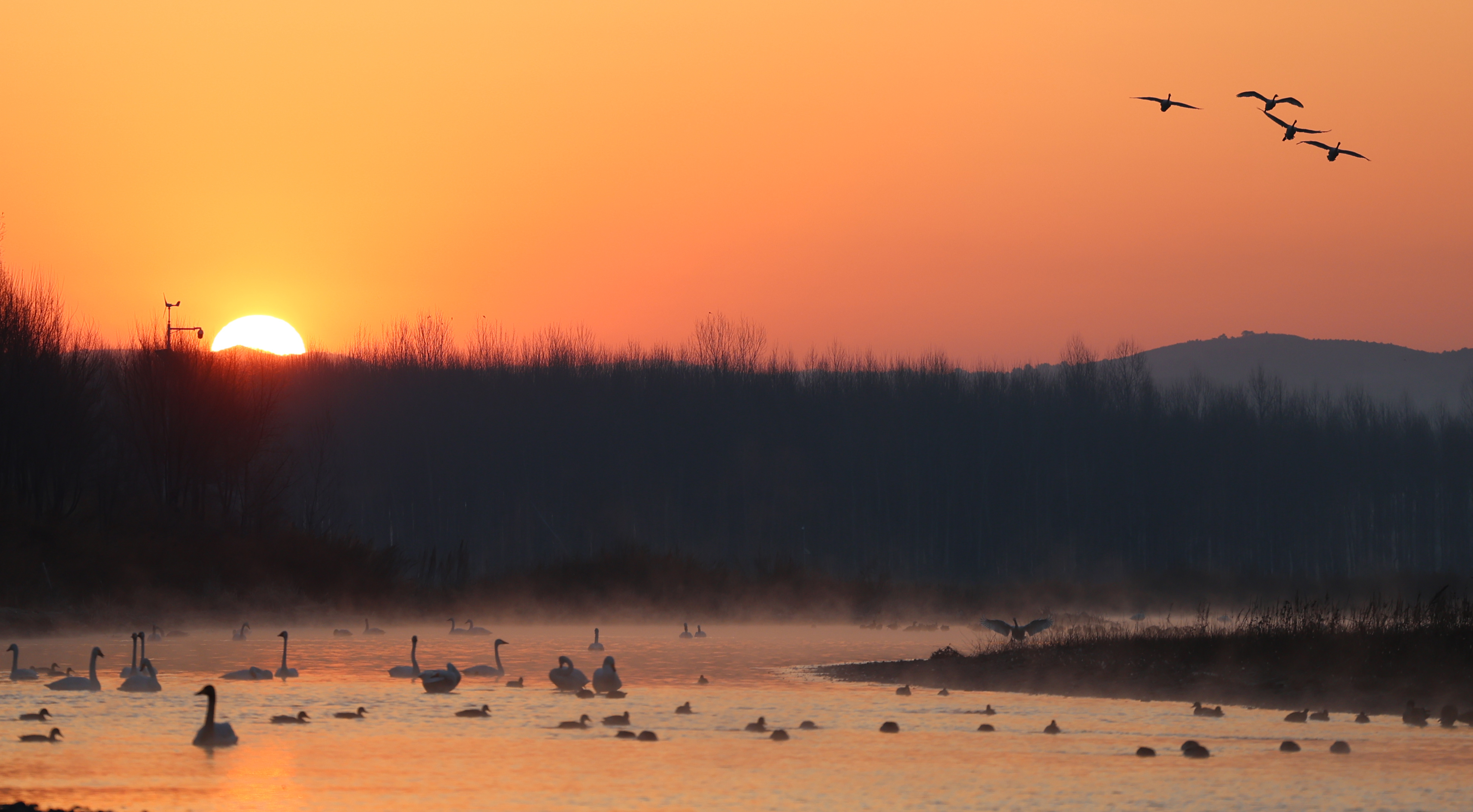 3月12日,天鹅在辽宁省北票市红村天鹅湾栖息。